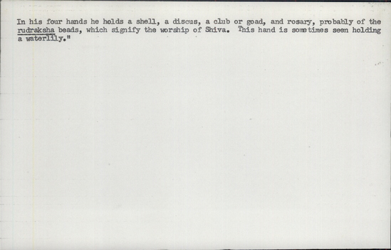 Placed in shrine for worship by men and women; daily worship, esp. Wednesday. Text from India ex. (1975): "Ganesh, locally called Ganpat, son of Shiva and Parvati, is the Hindu god of wisdom and prosperity. Plaques representing Ganesh are generally produced in time for Divali, the festival of lights held in October or November. At this time he is generally worshipped in conjunction with Laxmi, consort of Vishnu and goddess of wealth. [over] [on back of card] In his four hands he holds a shell, a discus, a club or goad, a rosary, probably of the 'rudraksha' beads, which signify the worship of Shiva. This hand is sometimes seen holding a waterlily." Made by men of the potter caste.